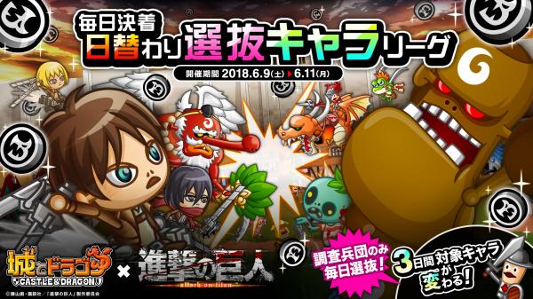 6月9日(土)からのリーグでは、日によって対象キャラが変わる「日替わり選抜キャラリーグ」が開催され、対象のキャラをリーダーにして勝利するとキャラPが獲得できます。今回の「日替わり選抜キャラリーグ」では『進撃の巨人』復刻コラボバージョンとして、「調査兵団」が毎日選抜対象キャラとしてキャラPが獲得できます。キャラリーグでは、獲得したキャラPによってキャラごとのランキングが決定し、順位の1番高いキャラのランキング報酬を獲得できます。また、日替わり選抜対象キャラの中で特定のキャラをリーダーにすると、能力値とスキル発動率が上昇する「リーダーハンディキャップバトル」を同時開催いたします。期間中、毎日変わる対象キャラをチェックしてリーグに挑みましょう!