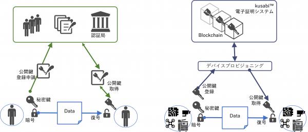 【図2:従来の認証局によるPKIと、kusabi(TM)によるIoTデバイス向けPKI】