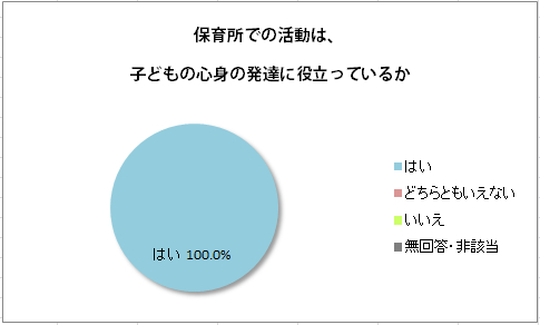 今後は、「さらなる改善が望まれる点」として指摘された「保育業務に役立つマニュアルの整備」や「医療の知識や乳児の救急法等を身に付け低年齢児の健康や安全を守る取り組み」をより一層強化していき、ご利用者様満足度の向上に努めてまいります。