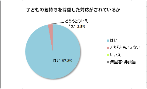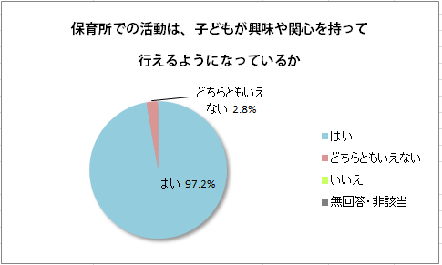 利用者調査では、48世帯(51人)のご利用者様が匿名のアンケート調査にご協力くださいました。有効回答を得られた36世帯のうち、城南ルミナ保育園のサービスに対して総合的に「大変満足」していると回答したのは44.4%(16世帯)、「満足」は52.8%(19世帯)、「どちらともいえない」が2.8%(1世帯)、全体としては97.2%の世帯に「満足」していただけているとの評価を頂きました。他にも、「保育所での活動は、子どもが興味や関心を持って行えるようになっているか」「提供される食事は、子どもの状況に配慮されているか」「子どもの気持ちを尊重した対応がされているか」などの質問は「はい」の割合がいずれも97%を超えていました。自由意見として「保育園で撮った写真等を見ると、(図工の時間などに)集中して制作している様子がわかります」「子どもの個性を大事にしてくれていると思います」などのご意見をいただきました。