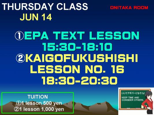 市川市での当EPAテキスト学習講座は6月14日(木)より、原則毎週木曜日の15:30から18:10の1レッスン2時間40分。受講料は実費並みの1レッスン500円、定員24名としている。(オンライン学習は月額2,000円)