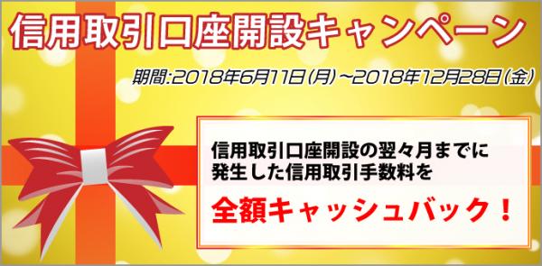 また、本サービス開始を記念して、2018年12月末までに信用取引口座を開設されたお客様を対象に、信用口座開設の翌々月末までの信用取引手数料を上限なく全額キャッシュバックする「信用取引新規口座開設キャンペーン」を実施いたします。