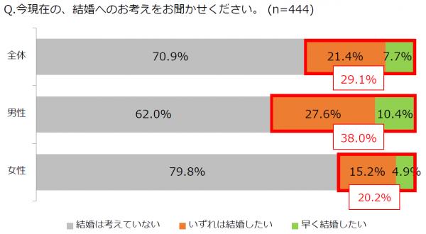 現在の結婚への意識を聞いたところ、「早く結婚したい」(7.7%)と「いずれは結婚したい」(21.4%)と回答した人の合計は29.1%となった。一方、「結婚は考えていない」と回答した人は70.9%に上った。