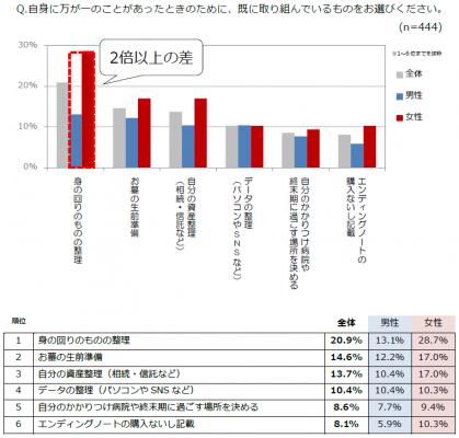 自身に万が一のことがあったときのために取り組んでいることの1位である「身の回りのものの整理」においては、「既に取り組んでいる」が男性と女性では2倍以上の差が開いた。また、2位には「お墓の生前準備」と続き、お墓への関心の高さも垣間みえる結果となった。唯一、男性の数値が上回った「データの整理(パソコンやSNSなど)」においても、差はわずか0.1%にとどまり、総じて女性の終活への関心度の高さが伺えた。