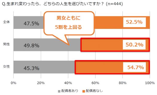 生まれ変わったら望む人生は「配偶者なし」(52.5%)、「配偶者あり」(47.5%)となった。半数以上の人が生まれ変わってもおひとりさまを望んでおり、現在の生活に満足していることが伺えた。