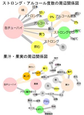 このことから「ストロング」「アルコール度数」の方が「果汁」「果実」よりも「缶チューハイ」との関係が強いことが分かります。