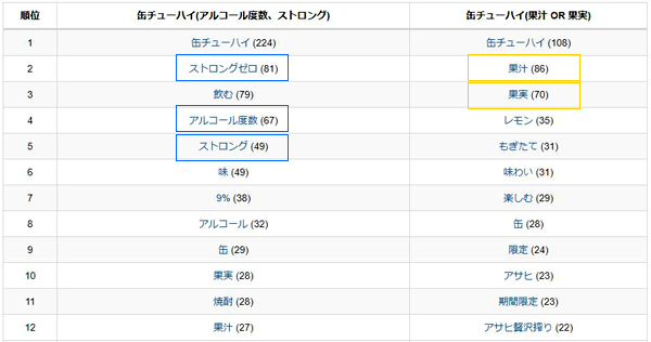 意外だったことは、どちらも女性が50%以上の書き込みとなっていることです。女性の方が「果汁」「果実」に対する関心が、やや高いという結果ですが、「ストロング」「アルコール度数」への関心もかなり高く、ビールよりも「缶チューハイ」の売上が伸びているその原動力は女性のニーズによるところかもしれません。