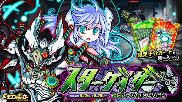 6月12日(火)より、復刻スペシャルダンジョン「スターゲイザー」を開催いたします。今回のダンジョンでは、限定子分カードや新たな敵が追加されます。前回の開催期間中に『ドラゴンポーカー』をまだプレイしていなかった方も、復刻開催する本ダンジョンをお楽しみください。