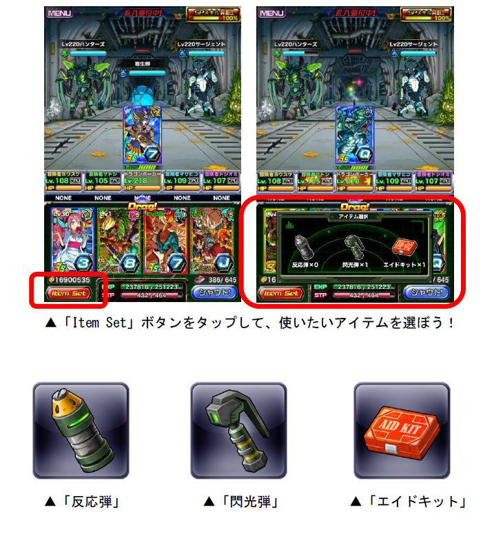本ダンジョンでは、「BET」ボタンが「Item Set」ボタンになります。「Item Set」ボタンを押すと装備選択が表示され、「反応弾」「閃光弾」「エイドキット」のうち、使いたい装備をタップすることで使用できます。アイテムにはそれぞれ違った効果があるので、各アイテムを有効に使ってダンジョンをクリアしましょう!