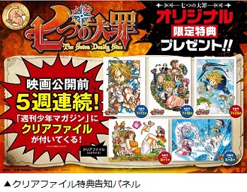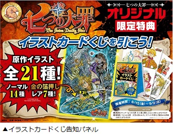 参加書店では、6月15日発売の32巻、8月17日発売の33巻を含め、新刊・既刊を集めた『七つの大罪』コミックスフェアを展開。企画期間中に参加書店にて『七つの大罪』を購入、もしくは映画「劇場版 七つの大罪 天空の囚われ人」のチケット半券を提示いただくと、オリジナル限定特典「七つの大罪 イラストカードくじ」を1枚引いていただけます。「イラストカードくじ」はノーマル14種+金の箔押しレア7種の全21種で、ブラインド封筒に入っており、コレクション性の高いアイテムです。更に、映画公開前の5週間(7/11、7/18、7/25、8/1、8/8)に発売となる『週刊少年マガジン』をお買い上げのお客様には、週ごとに異なるデザインのオリジナルクリアファイル(全5種・A5サイズ)をプレゼントします。