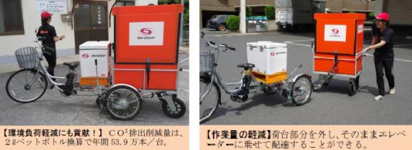 SBSグループのロゴマークをあしらった配送用自転車を2台用意し、本年4月からテスト配送を開始。テスト配送では、車両で15分ほどかかっていたエリアに5分で到着できるようになったことや、着脱可能な荷台のまま棟内を配達するなど、時間および作業量の軽減効果が確認できました。また、配送員が、住民の方々の目に留まる存在になったことでお客様とのコミュニケーションが活性化するという、想定していなかった効果も得ることができました。