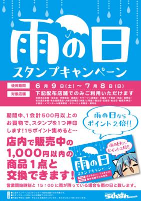 内容:対象店舗で1会計500円以上の購入者に1スタンプ。雨の日はスタンプ2倍。スタンプが15個たまると、その場で1,000円以内の商品(店内で販売中のもの)1点と交換が可能です。