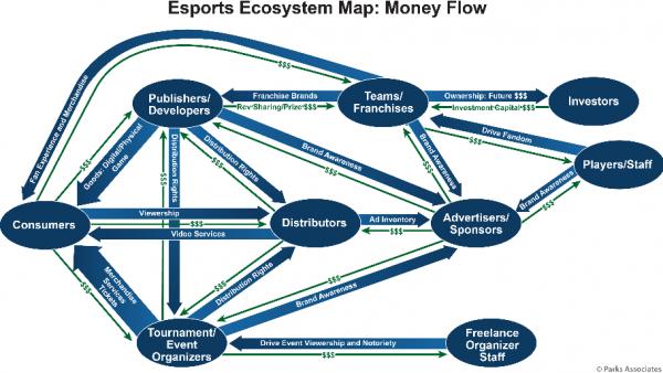 Eスポーツ業界は、ゲーム開発者やビデオストリーミングプラットフォームのような企業を超えて、新しく地元密着型ではないブランドが市場に参入することで注目を集めている。さまざまな市場分野の主要企業はすでにプロバスケットボール、サッカー、ホッケーチームのオーナーやESPNやTBSのようなメディアアウトレットなどの、伝統的なスポーツの実体であるEスポーツチームやブランドに投資している。米国調査会社パークスアソシエイツ社(Parks Associates)の調査レポート「デジタルネイティブ:Eスポーツの台頭」は、Eスポーツのエコノミクスを分析し、現在の市場の企業とその戦略や観客の規模を特定して、Eスポーツ市場の収益化に関心を抱く企業のビジネスチャンスと可能性を査定している。