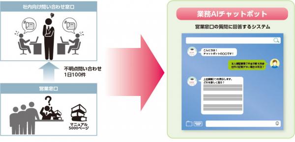 サービス第一弾として、金融機関内の問い合わせ業務をAIが代行するチャットボットクラウドサービスを提供します。行員からの商品・サービスの問い合わせにAIがチャットで対応するチャットボットサービスの活用は、社内向け業務の効率化を支援します。