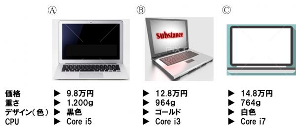簡単にノートパソコンの事例で「コンジョイント分析」のイメージを記したい(図1参照)。今、ノートパソコンA, B, Cがあり、各ノートパソコンの比較対象として4つの属性(価格、重さ、デザイン(色)、CPU)、また各属性にはそれぞれ3水準(価格;9.8万円・12.8万円・14.8万円、重さ;764g・964g・1,200g、デザイン(色);白色・黒色・ゴールド、CPU;Core i3・Core i5・Core i7)があるとする。ノートパソコンAは、9.8万円・1,200g・黒色・Core i5であり、ノートパソコンBは、12.8万円・964g・ゴールド・Core i3、ノートパソコンCは、14.8万円・764g・白色・Core i7であるとき、被験者にA, B, Cのノートパソコンのうち購入したい順に1位から3位まで記述してもらうだけで、消費者がどの属性を重視しているのか(=相対的重要度)、また各属性の中でどの水準を重視しているのか(=効用値)、かつ最適な水準の組み合わせを呈示することができるのである(注;上記例を実際にコンジョイント分析する場合、4つの属性に各3水準ずつあるので直交表を用いても9枚のカードを作成する必要があるが、ここではあくまでも分析イメージをお伝えすることを優先した)。