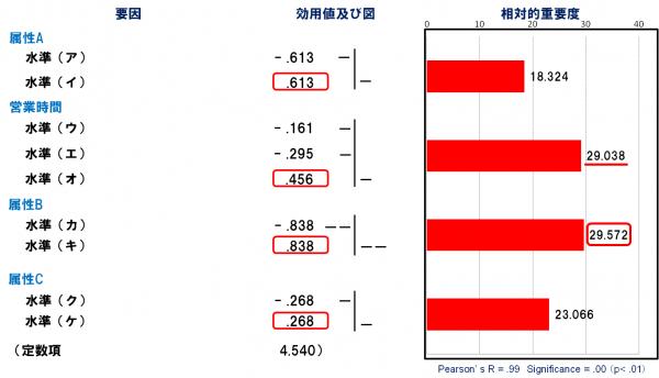 以上、本調査結果から、コンジョイント分析に用いた4つの属性では「属性B」、「営業時間」、「属性C」、「属性A」の順に重視されており、また属性Bの中では「水準(キ)」が重視され、「営業時間」の中では「水準(オ)」が重視されていることが分かった。