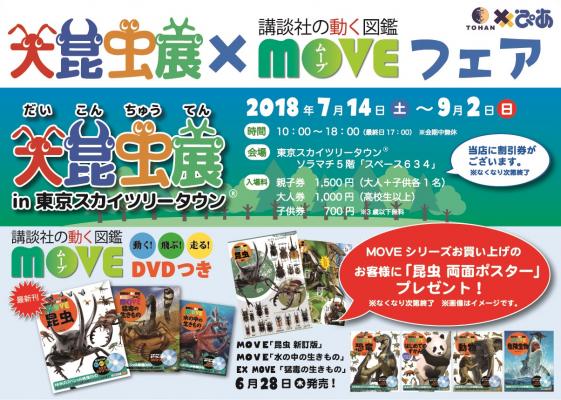 株式会社トーハン(本社・東京都新宿区、藤井武彦社長)は、ぴあ株式会社(本社・東京都渋谷区、矢内廣社長)との共同事業「TOPIA Project」において、「大昆虫展in東京スカイツリータウン(R)」と講談社「動く図鑑MOVE」連動企画を6月22日(金)~9月2日(日)まで全国1,218書店にて実施します。