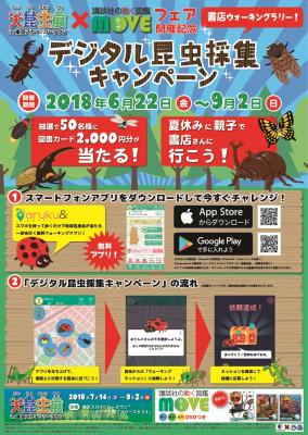 また参加書店のうち首都圏の書店では、今年で6回目を迎える夏休みの人気イベント「大昆虫展in東京スカイツリータウン(R)~みんなで行こう!ソラマチ昆虫祭~」と連携し、店頭で入場割引券付きのしおりを配布。しおりの裏面は「MOVE」の告知広告となっており、購買意欲の喚起を狙います。店頭にはフェアパネルや「大昆虫展」告知ポスター等を掲出して来店客に「大昆虫展」を告知する一方、「大昆虫展」公式ホームページでキャンペーン開催書店を掲載するなどの連携により、書店と「大昆虫展」の相互送客をはかります。
