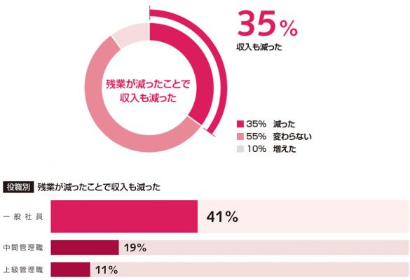 残業が減ったと答えた457人のうち35%(160人)は残業減の影響で「収入も減った」と回答しました。役職別に見ると上級管理職では「収入も減った」のは残業が減った人のうち11%、中間管理職では19%だったのに対し、担当者レベルの一般社員では41%に上ります。給与体系の違いもあるなか、一般社員では残業減によって収入にも影響が出ている人が半数近くいることがわかりました。