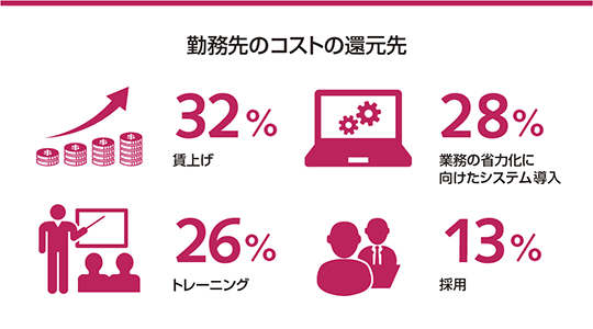 「勤務先で残業コストが減った分、従業員への還元があったと感じるか」の問いに対し、残業が減ったと答えた会社員の83%(452人中373人)は「(コスト還元の)実感は無い」と答えました。「実感がある」と答えた17%(79人)によると還元先は1位「賃上げ」(32%)、2位「業務の省力化に向けたシステム導入 」 (28%)、3位「トレーニング」(26%)。賃上げに残業コストが還元されている企業は回答者の勤務先全体のうち1.2%と、未だ少数派であることがうかがえます。