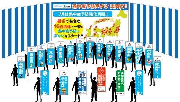 上記参加自治体では、各自治体の庁舎前等で同日同時刻一斉に“出陣式のぼり“を掲げて出陣式を実施し、来庁者の皆様に「熱中症に気をつけて」と声をかけながら、熱中症対策ドリンク、ウチワを無料配布いたします。