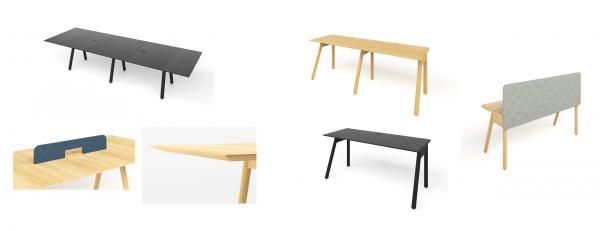 天板は連結W3600mmタイプと単体W2000 mmタイプの2種類。高さは1000 mm(立ちと座りを両立する高さ)、720 mm、650 mm(ゆったりとした柔らかい姿勢を提供)から選べます。オプションのデスクトップパネルやサイドパネルを使えば、集中ワークにも利用できます。高さ180 mmデスクトップパネルは、オープンでありながらパーソナルな領域を作り出し、新たな働き方のフルマイを促します。
