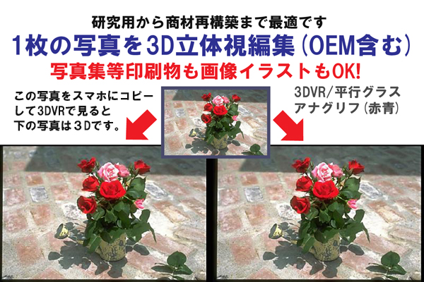 重要事項:写真や印刷物、1枚の画像等を立体視で見る場合は、弊社3D立体視編集が必要です。