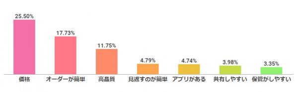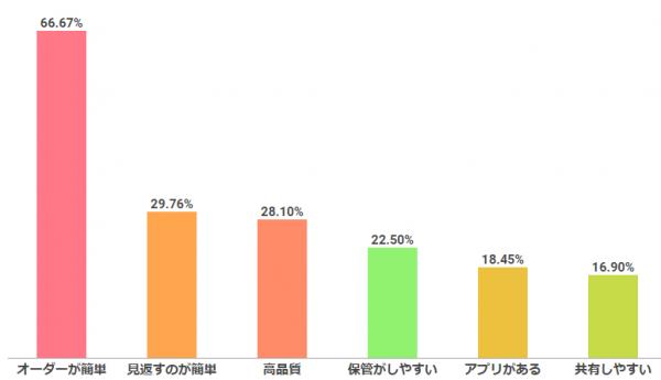 またもう一つ注目したいのが、「共有したい」という項目。近年ではSNSの普及により、写真共有サービスが流行していると言われているが、「自分の子どもの写真」に限っては、他人との共有よりも、自分たちが簡単に振り返ることができるかどうかを重要視しているのではないだろうか。