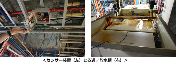 須磨海浜水族園地下のろ過室に設置されている、ミズタコの水槽専用のろ過/貯水槽経路にセンサーを取り付け、水環境を計測。また、接続している装置内には環境センサーを設置して室内の温度、湿度等を計測します。