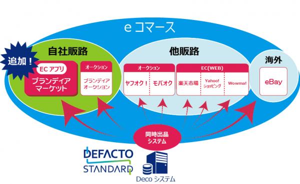 デファクトスタンダードの主な国内販路は、「自社販路」の『ブランディアオークション』、『ヤフオク!』をはじめとする「オークションサイト」、『楽天市場』『Wowma!』などの「EC(WEB)サイト」がメインでした。今回の『ブランディア マーケット』による販路拡大は、自社販路の中の「ECアプリ」という新たなカテゴリの位置付けになります。