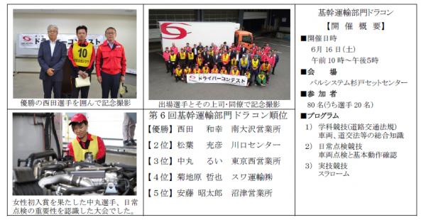 SBSゼンツウ株式会社(社長:近藤治水、埼玉県戸田市)は、6月16日、埼玉県杉戸町のパルシステム杉戸セットセンターにて、第6回基幹運輸部門ドライバーコンテスト(以下ドラコン)を開催しましたのでお知らせします。