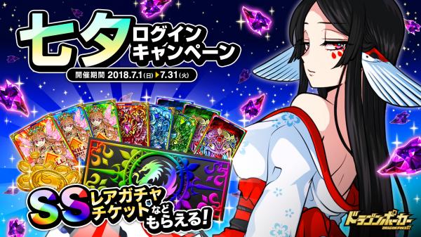 期間中、25日間ログインすると、「竜石」が最大30個もらえる「七夕ログインキャンペーン」を開催いたします。5日ログインごとに「ドラゴンメダル」や「女神スキルフェアリ-」など豪華アイテムをプレゼント!ログイン25日目には「SSレアガチャチケット」が必ずもらえます。『ドラゴンポーカー』に毎日ログインして、豪華報酬を受け取りましょう!