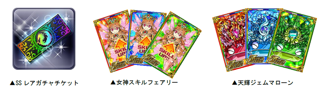 竜石30個、SSレアガチャチケット 1枚、女神スキルフェアリー各1枚ずつ、天輝ジェムマローン各1枚ずつ、SS進化指輪各1枚ずつ、ドラゴンメダル300枚