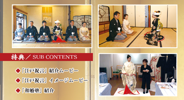 特典映像は巷で話題の「江戸祝言」を映像で再現。日本人の心に沁みる逆に新しい婚礼スタイルを紹介。また、婚礼の仕事にかかわる「和のプロフェッショナル」を目指す方が受講する「和婚塾」の内容をダイジェストで紹介します。
