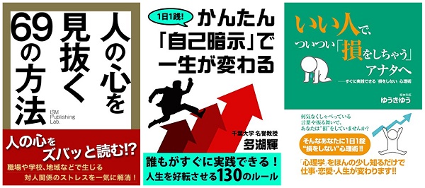 今回割引対象となるタイトルは、2018年5月の【心理】書籍のダウンロード数ランキング(集計対象ストア:Kindleストア、楽天Kobo電子書籍ストア、Google Play、iBooks、SONY Reader Store、Yahoo!ブックストア)で1位に輝いた『人の心を見抜く69の方法』(ISM Publishing Lab.=著)、2位の『1日1践! かんたん「自己暗示」で一生が変わる』(多湖輝=著)、3位の『いい人で、ついつい「損をしちゃう」アナタへ』(ゆうきゆう=著)の計3作品です。
