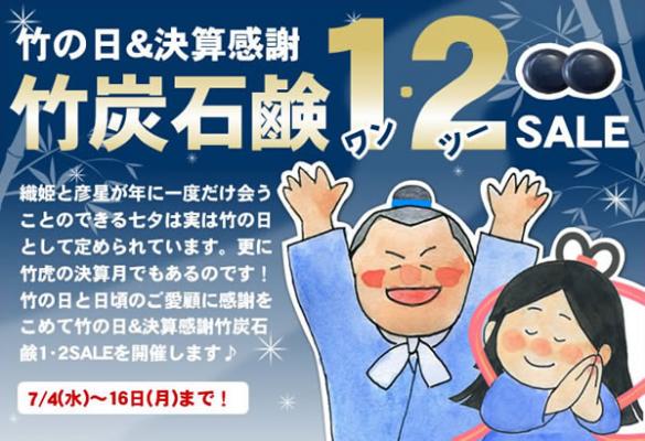 竹は生命力や抗菌力が強く、一年通して青々と繁る姿は神聖で縁起が良いともいわれています。一年の後半戦に入る節目の7月にこそ、心も体もリフレッシュ、清々しい気持ちになる竹虎自慢の竹グッズをお届けしたいのです。竹の日&決算感謝♪竹炭石鹸ワンツーSALEは2018年7月4日(水)~2018年7月16日(月)まで開催。お祭り気分で楽しんで下さい。
