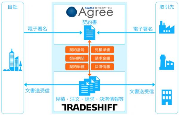 GMOインターネットグループのGMOクラウド株式会社(代表取締役社長:青山 満 以下、GMOクラウド)が提供する「GMO電子契約サービスAgree(以下、GMO電子契約Agree)」(URL:https://www.gmo-agree.com/ )と、Tradeshift Inc. (本社:米国)の日本法人、トレードシフトジャパン株式会社(代表取締役社長:大久保 紀章 以下、トレードシフトジャパン)が提供するグローバル電子取引プラットフォーム「Tradeshift」(URL:https://tradeshift.com/ja/)は、本日2018年7月5日(木)よりサービス連携を開始いたしました。