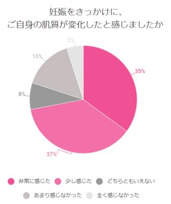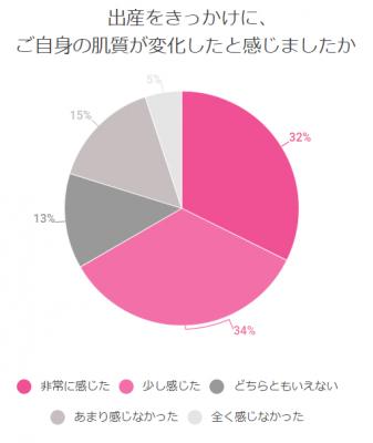 調査の結果、妊娠を機に肌質の変化を感じたママは7割以上。出産を機に感じたママは6割以上。妊娠・出産のいずれにおいても過半数を超える方が肌質の変化を感じていることが分かった。