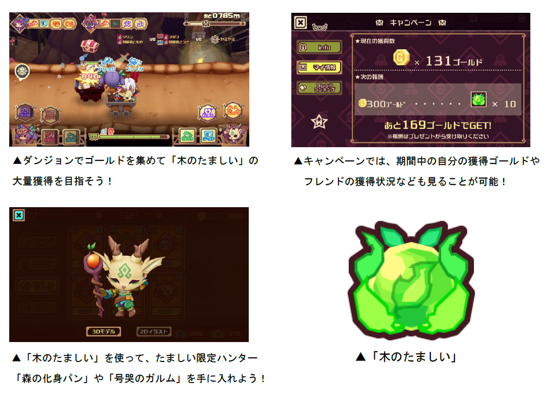 7月7日(土)より開催される「木のたましいキャンペーン」では、“ダンジョン”に挑戦し、獲得したゴールドに応じて、「木のたましい」が手に入ります。たましいを集めると、ゲーム内ショップにて、限定ハンターを仲間にすることができます。このチャンスに、「木のたましい」の大量獲得を目指しましょう!