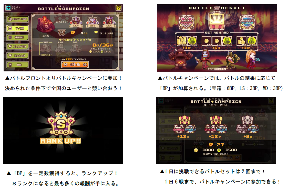 「第11回バトルキャンペーン」は期間中、指定されたバトルモードとダンジョンでの戦績を全国のユーザーと競い合うイベントです。1日2回のバトルセットが行われ、1回のバトルセットでは、3戦までバトルに参加することができます。バトルキャンペーンは、毎回Dランクからスタートし、バトルの結果に応じて、「BP」が加算されます(宝箱:6BP, LS:3BP, MD:3BP)。「BP」が一定ポイントに到達するとランクがアップし、最高ランクのSランクになると、多くの経験値やゴールド、バトルメダルを手に入れることができます。