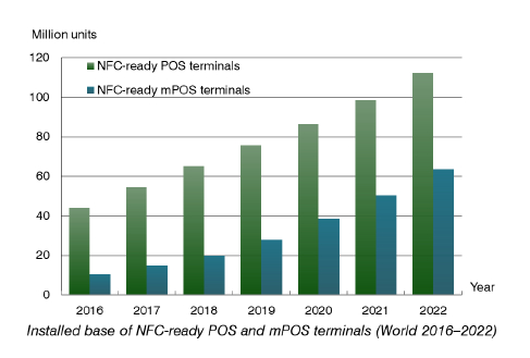 POS端末はセルラー接続が一般的になってきており、2017年の世界のセルラーPOS端末の導入数は3770万に達するだろう。ベルグインサイト社はセルラーPOS端末は2017-2022年に年平均成長率(CAGR)10.1%で成長して、予測期間終了時には総計6100万に達するだろうと予測している。近距離通信(NFC)対応のPOS端末も力強く成長し、世界の2017年の年間出荷数は2470万に達するだろうと予測している。