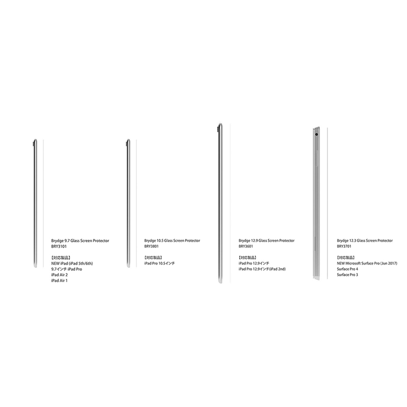BRYDGE Glass Screen Protectorは、BRYDGEシリーズのハードケース一体型Bluetoothキーボードに対応した、iPad、Surface用の高透過ガラス液晶保護フィルムです。厚さわずか0.3mm、硬度9Hの高耐久かつ耐衝撃仕様、汚れや指紋の付着を防止する特殊コーティングにより、大切なiPadやSurfaceをしっかりと保護します。