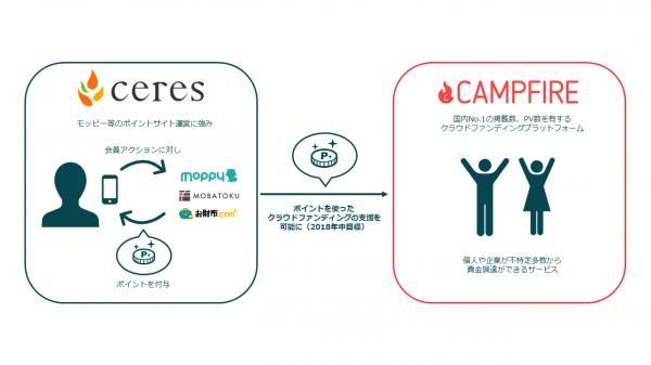 今回の提携により、2018年中にモッピーをはじめとしたポイントサイトで発行されるポイントを使い、CAMPFIREにてクラウドファンディングへの支援を可能にすることを目指します。また業務提携に併せて、セレスがCAMPFIREの一部株式を取得いたしました。