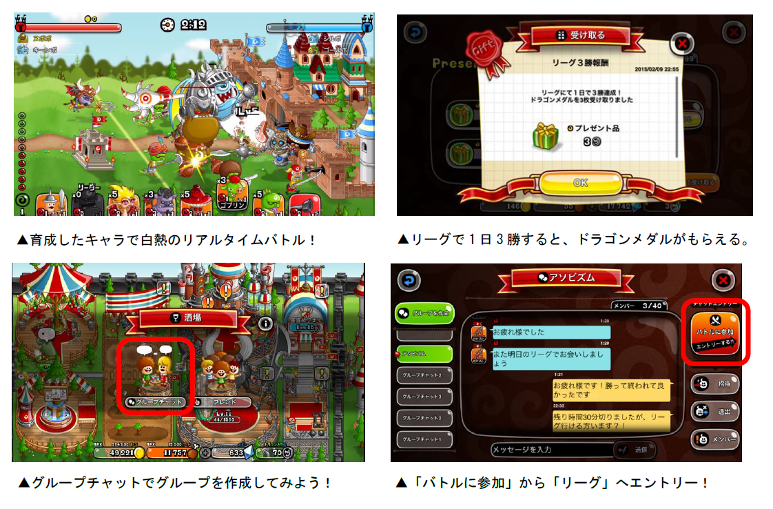 7月15日(日)から、グループチャットから「リーグ」に参加し、勝利すると「グルチャP」を獲得できる「グルチャリーグ」を開催いたします。また、「グルチャリーグ」に参加して勝利すると、報酬としてドラゴンメダルが1日最大5枚獲得できる「グルチャリーグで勝利キャンペーン」を開催いたします。仲間たちとグルチャに参加して、ドラゴンメダル獲得を目指しましょう!