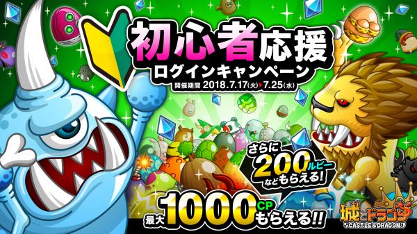 7月17日(火)より、期間中にログインするだけでCPなどのアイテムがもらえる「初心者応援ログインキャンペーン」を開催いたします。また、城Lv20以下のプレイヤーと一緒にバトルを行なうと特典がある「ルーキーさまさまキャンペーン」を同時開催いたします。