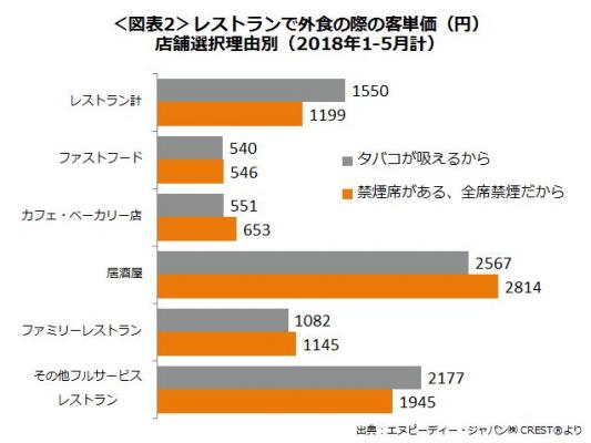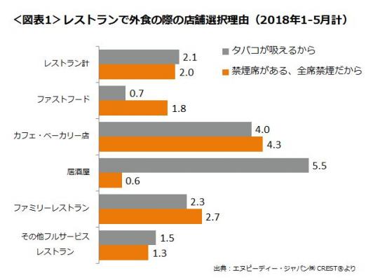2018年1-5月計における、レストランで外食の際の店舗選択理由比率をみてみると(図表1)、レストラン計では、「タバコが吸えるから」2.1%、「禁煙席がある、全面禁煙だから」2.0%でほぼ同じ比率であることが分かりました。ファストフード、カフェ、ファミリーレストランでは「禁煙席がある、全面禁煙だから」の比率が「タバコが吸えるから」を上回りました。一方で居酒屋では「タバコが吸えるから」が5.5%で、「禁煙席がある、全面禁煙だから」0.6%を大きく上回りました。