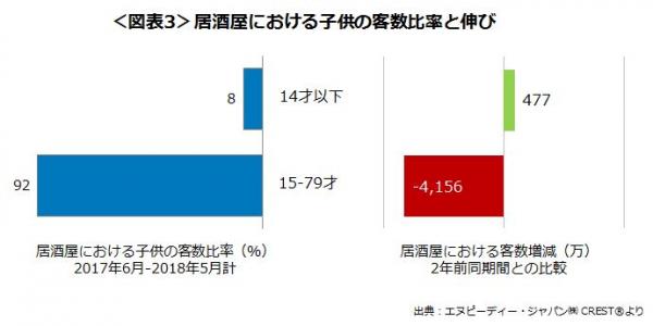 喫煙重視派の多い居酒屋では、全面禁煙化で売上減少を危惧しているでしょう。前述のように、客単価は禁煙重視派の方が高い傾向にあることは、一つのビジネスチャンスと映ることでしょう。また、居酒屋における子供の客数をみると(図表3)、14才以下の比率は8%で、減少している大人の客数とは逆に増加していることが分かります。