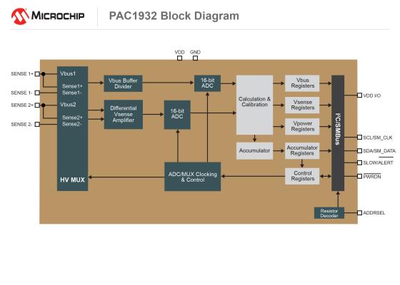 2チャンネル製品として業界で唯一16ビットの電力計測をサポートしたPAC1932は、ホストの介在なしに最短でも17分間まで積算電力計測が可能で、電圧または電流のレンジを調整せずに電力と電力量を計測できます。PAC1932/33は16ビットA/Dコンバータ(ADC)を2個内蔵して電圧と電流を同時に計測できるため、正確な電力計測が可能です。これによりシステム設計を改善し、効率的に消費電力を低減できます。