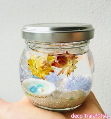 瓶の中に砂や貝も入れて夏にぴったりな "海のハーバリウム"を制作します。