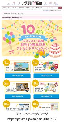 株式会社サンロフトが発行している、幼稚園・保育園・こども園の園長・保育者向けIT専門紙「パステルIT新聞」(https://passtell.jp/)は、2018年7月号(6月20日発行)にて創刊10周年を迎えました。そこで、創刊10周年を記念して、紙面をリニューアルするとともに、本日より「パステルIT新聞創刊10周年記念プレゼントキャンペーン」を開始しました。キャンペーンでは、教育・保育活動に役立つ賞品を、総勢157名にプレゼントします。